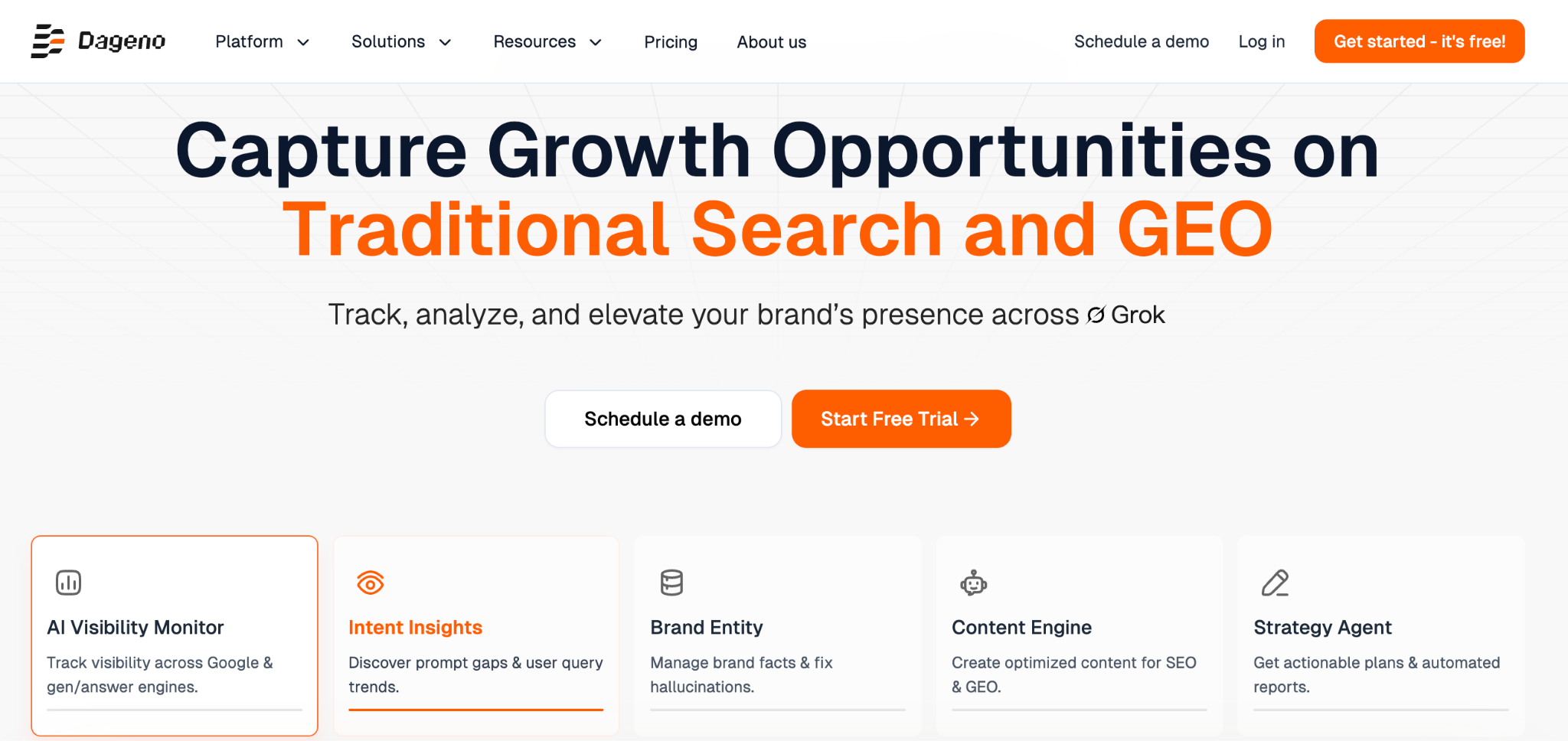 Instead of acting as a passive analytics layer, Dageno functions as a full-stack GEO (Generative Engine Optimization) agent platform, designed specifically for enterprise-scale brand management in the AI search era.