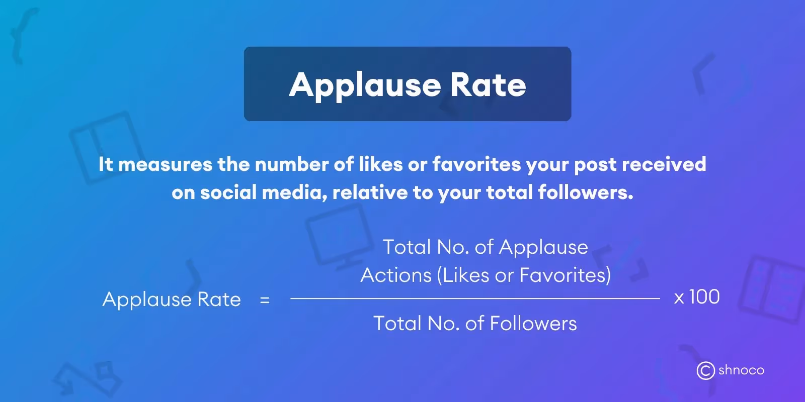The applause rate measures the number of likes or favorites your post received on social media, relative to your total followers. This metric indicates the percentage of your followers who applaud your brand or the content you are posting.