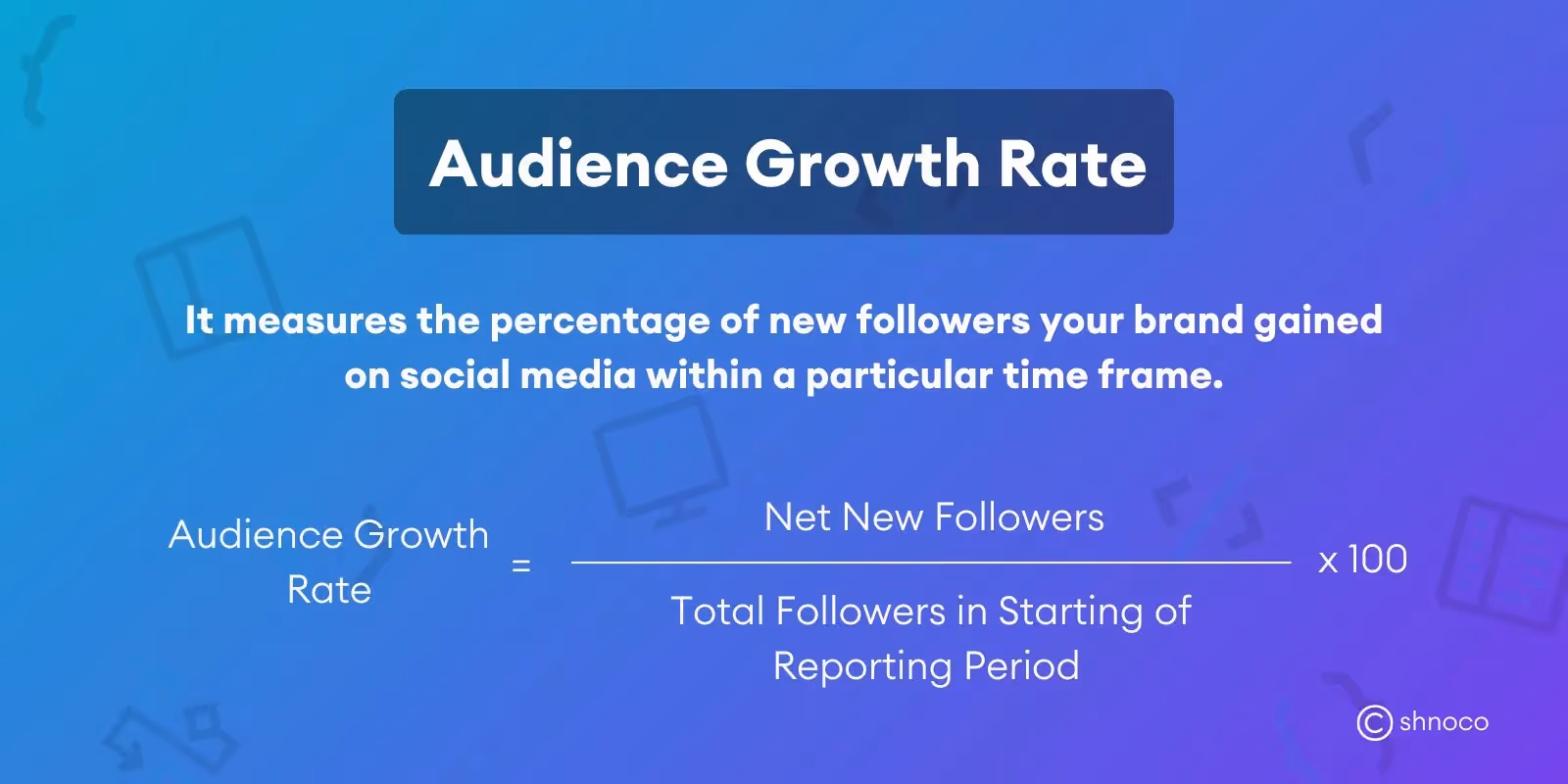 To calculate the audience growth rate, begin by selecting a reporting period. Then, divide the number of ‘net new followers’ in that period, by the ‘total audience’ or followers in starting of the reporting period and multiply by 100.