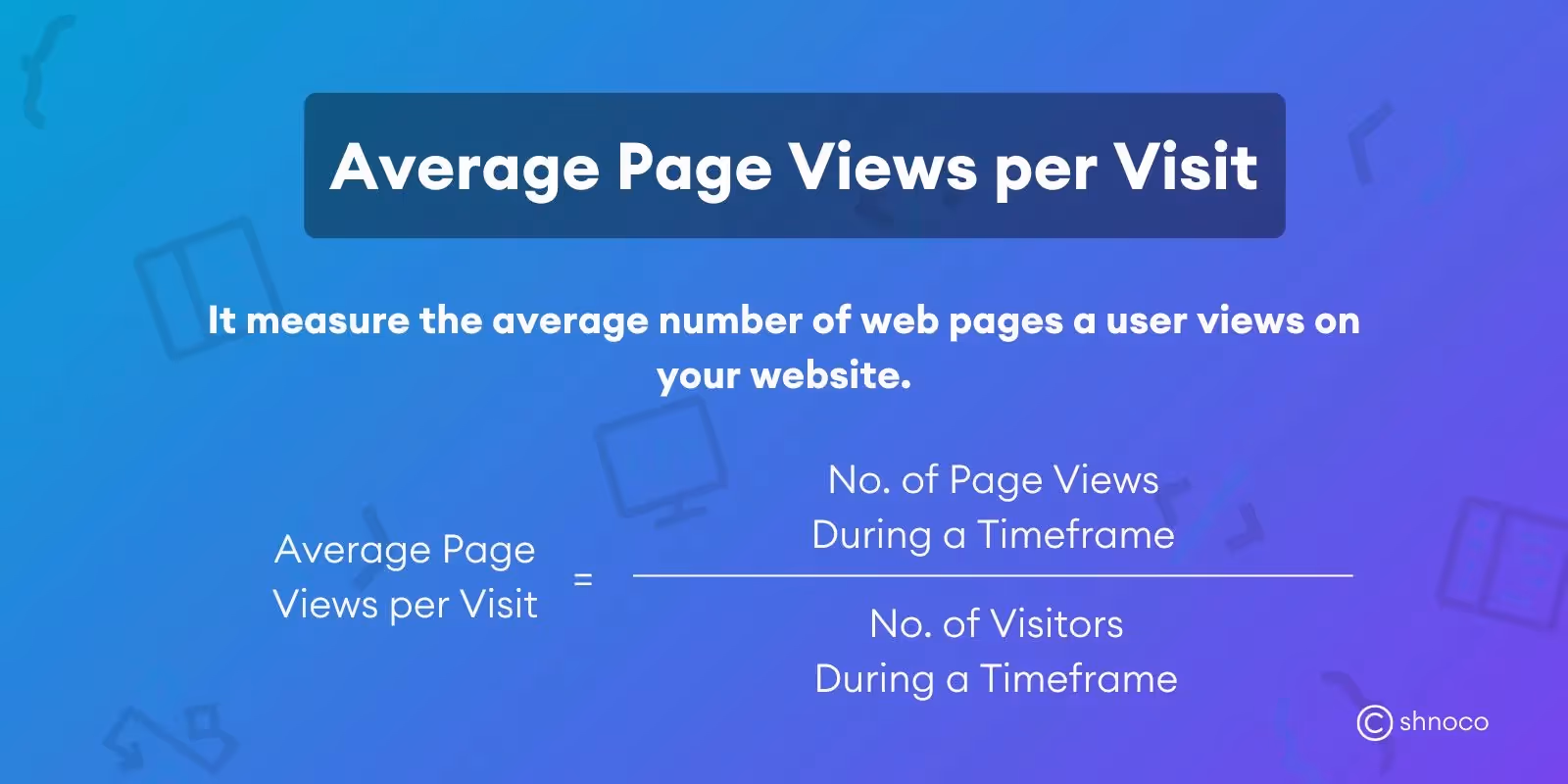 Average page views per visit measure the average number of web pages a user views on your website. This metric is used to gauge how compelling your site is to your users and how well it is arranged and easy to navigate.