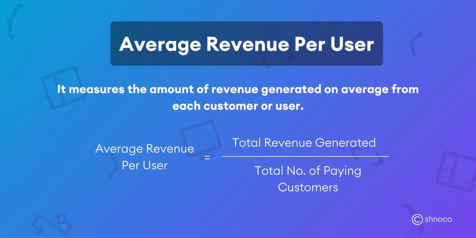 Average revenue per user metric measures the amount of revenue generated on average from each customer or user. This metric gives you an idea of how much the average customer spends on your company.