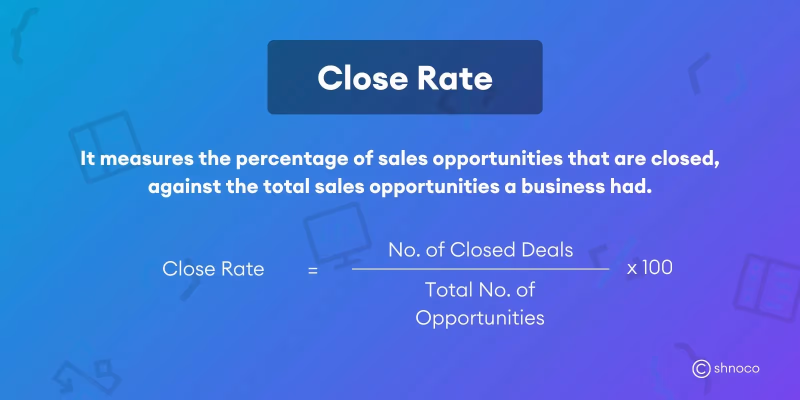 Close rate is a sales metric that measures the percentage of sales opportunities that are closed, against the total sales opportunities a business had.