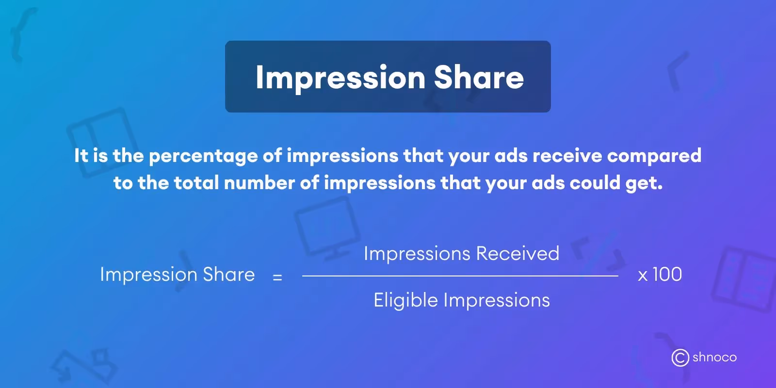 Impression share (IS) is the percentage of impressions that your ads receive compared to the total number of impressions that your ads could get – Google