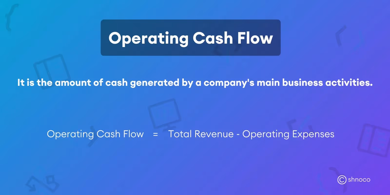 To calculate operating cash flow, subtract ‘operating expenses’ (such as payroll, marketing investment, rent, etc.) from the ‘total revenue’ (from product/subscription sales, upsells, etc.)
