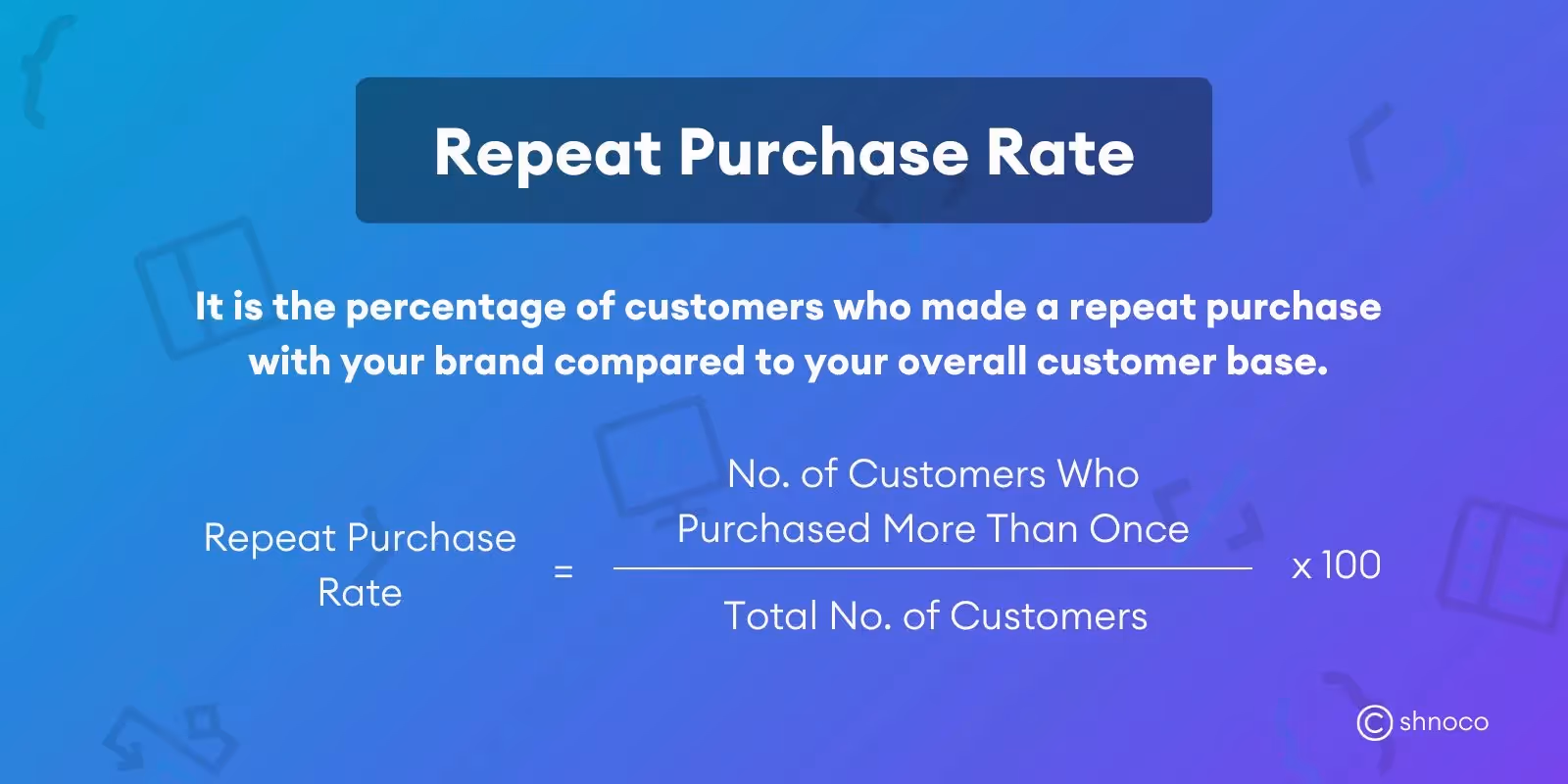 Therefore, your repeat purchase rate would be: 900/5000 x 100 = 18%