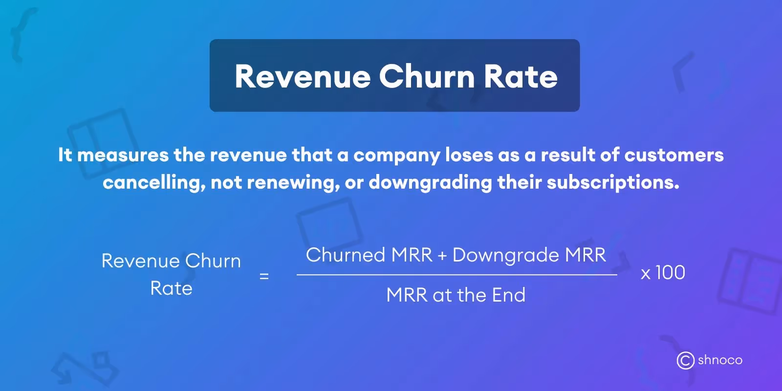 Revenue churn rate metric measures the amount of revenue that a company loses as a result of customers cancelling, not renewing, or downgrading their subscriptions or contracts. This metric is typically used to assess the effectiveness of a company's customer retention efforts.