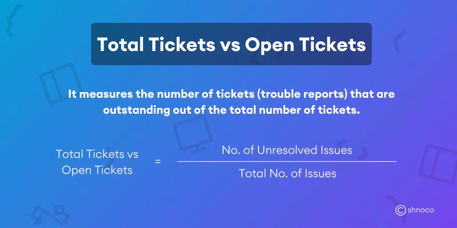 To calculate total tickets vs open tickets, divide the ‘number of unresolved issues’ (open tickets) by the ‘total number of issues’ (total number of tickets) in a time period.