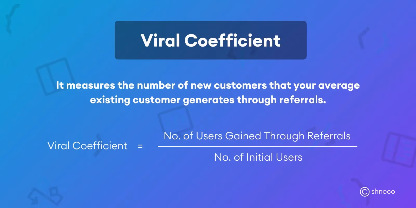 To calculate the viral coefficient, divide the ‘number of users gained through referrals’ by the ‘number of initial users’.